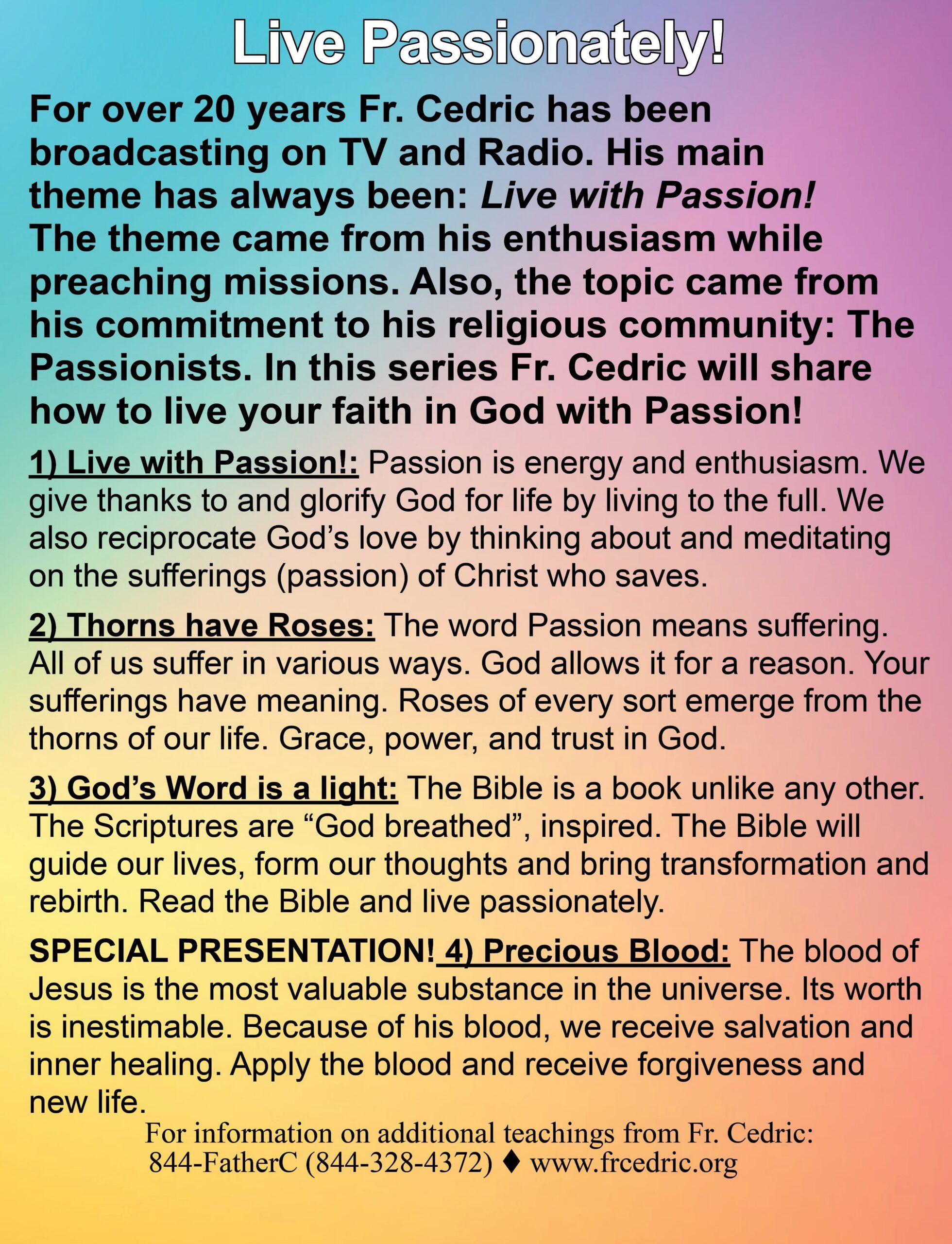Live Passionately! Series 1055 – For over 20 years Fr. Cedric has been broadcasting on TV and Radio. His main theme has always been: Live with Passion! The theme came from his enthusiasm while preaching missions. Also, the topic came from his commitment to his religious community: The Passionists. In this series Fr. Cedric will share how to live your faith in God with Passion!