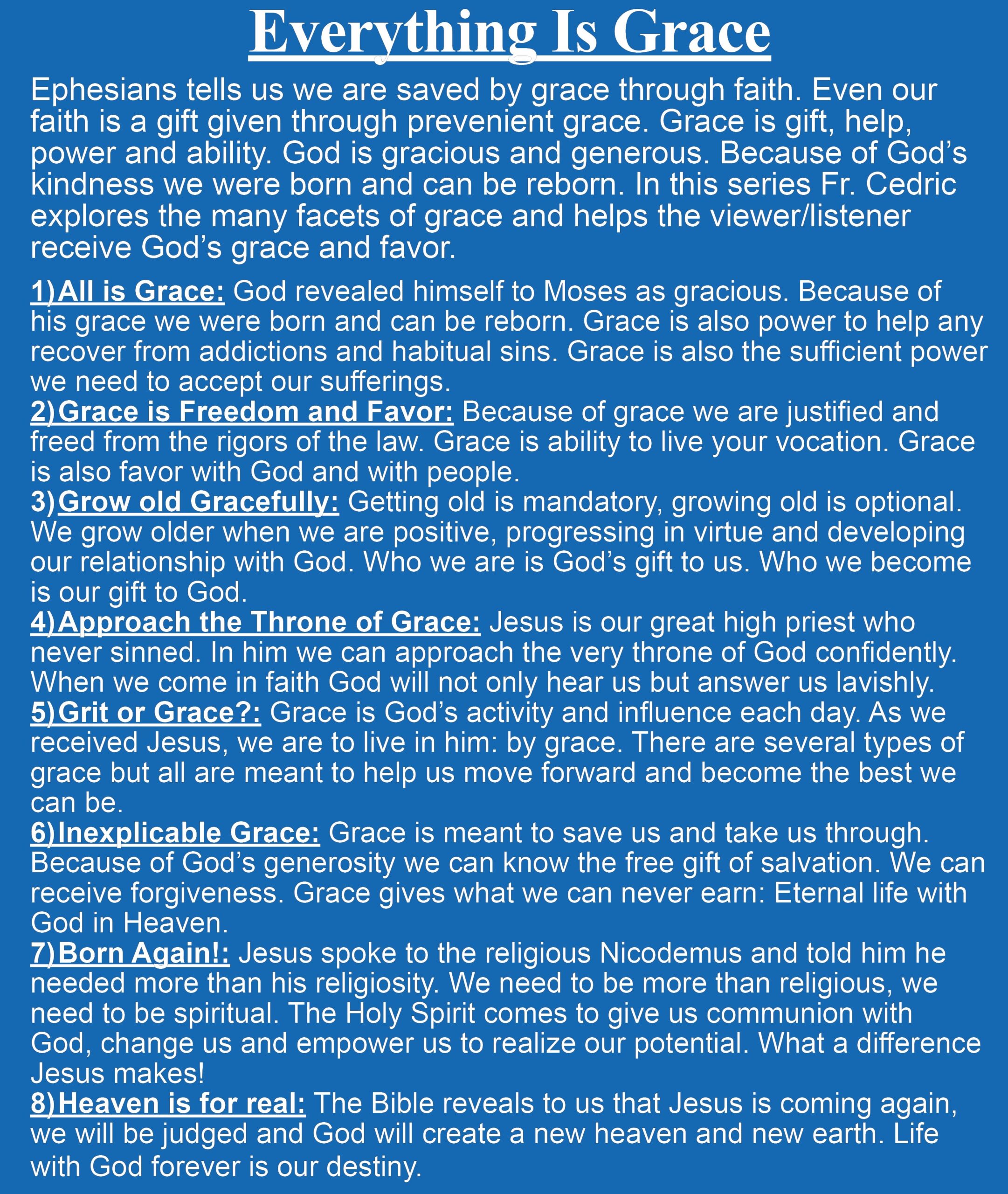 Everything is Grace Series 900 – Ephesians tells us we are saved by grace through faith. Even our faith is a gift given through prevenient grace. Grace is gift, help, power and ability. God is gracious and generous. Because of God’s kindness we were born and can be reborn. In this series Fr. Cedric explores the many facets of grace and helps the viewer/listener receive God’s grace and favor. Topics in Series 900 include: All is Grace, Grace is Freedom and Favor, Grow Old Gracefully, Born Again!, Heaven is For Real, and more!