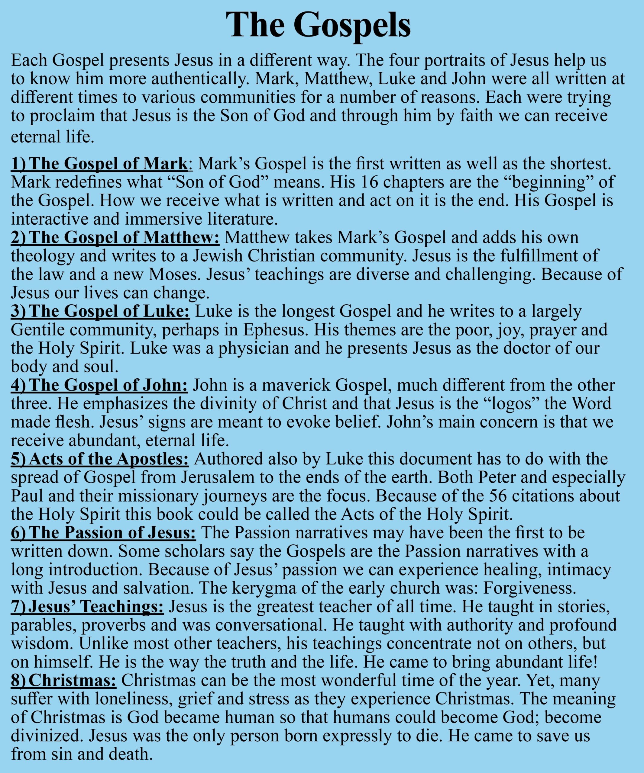 The Gospels: Series 955 – Each Gospel presents Jesus in a different way. The four portraits of Jesus help us to knew him more authentically. Mark, Matthew, Luke and John were all written at different times to various communities for a number of reasons. Each were trying to proclaim that Jesus is the Son of God and through him by faith we can receive eternal life.